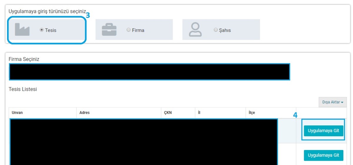 Uygulama türünde tesis seçilecek olup, aşağıda yer alan tesis listesinden hangi şube/tesisten atık gönderimi yapılıyorsa seçilip uygulamaya git sekmesi ile tesise ait olan uygulamaya gidilmelidir.