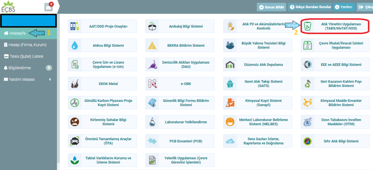 Anasayfa üzerine gelindikten sonra Atık Yönetim Uygulaması (TABS/MoTAT/KDS) seçilir.
